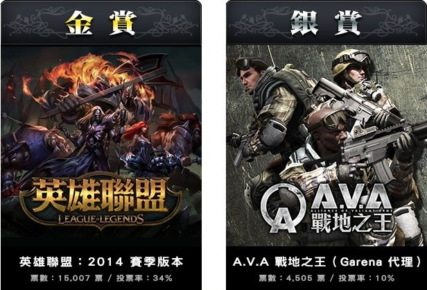 而歷經近三週的投票後,Garena 旗下《英雄聯盟》與《A.V.A 戰地之王》獲得 2014 年度巴哈姆特遊戲大賞線上遊戲其他類金賞與銀賞殊榮,其中《英雄聯盟》更獲得 15,007 票為全場得票數最高的遊戲。
