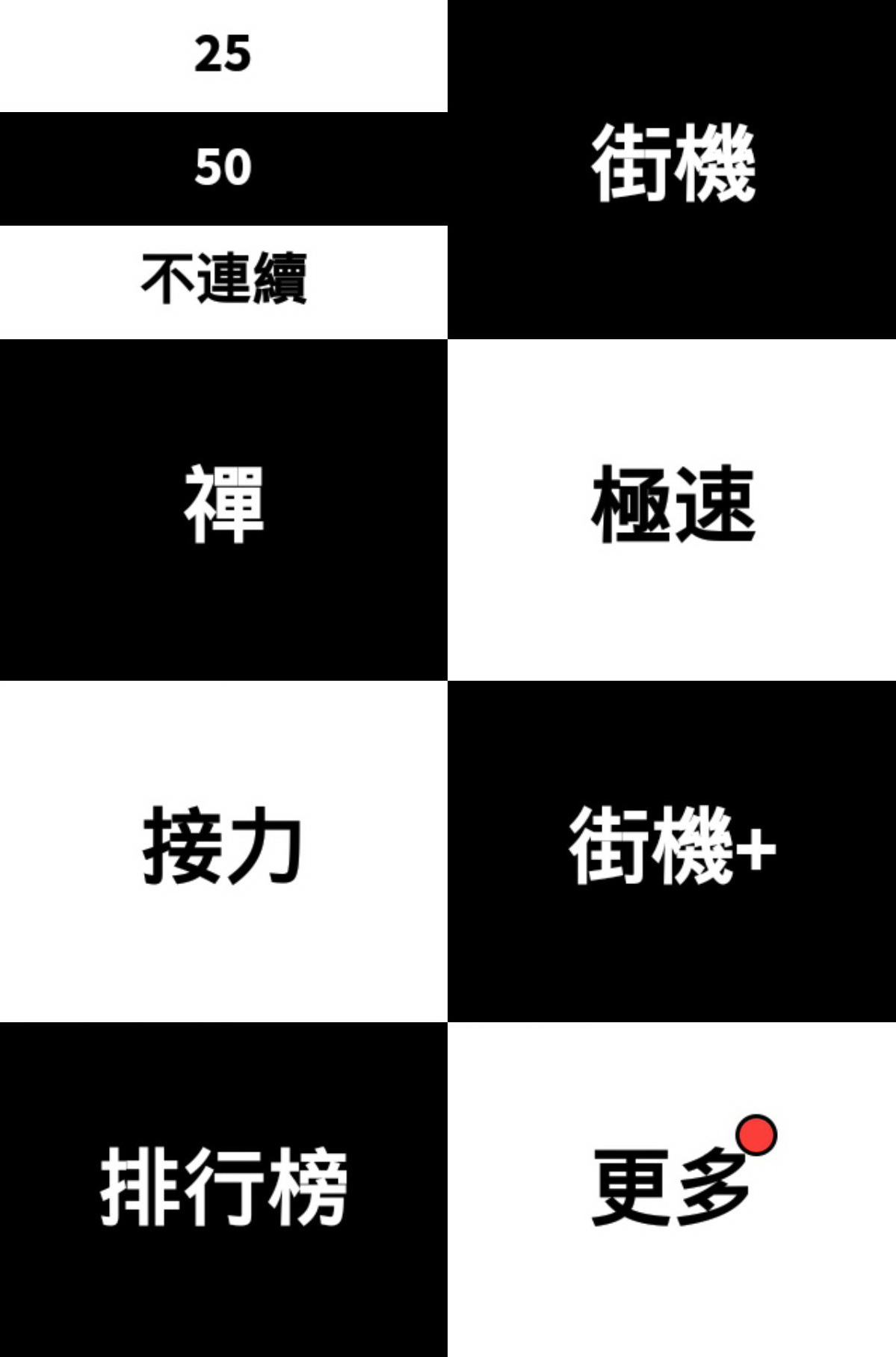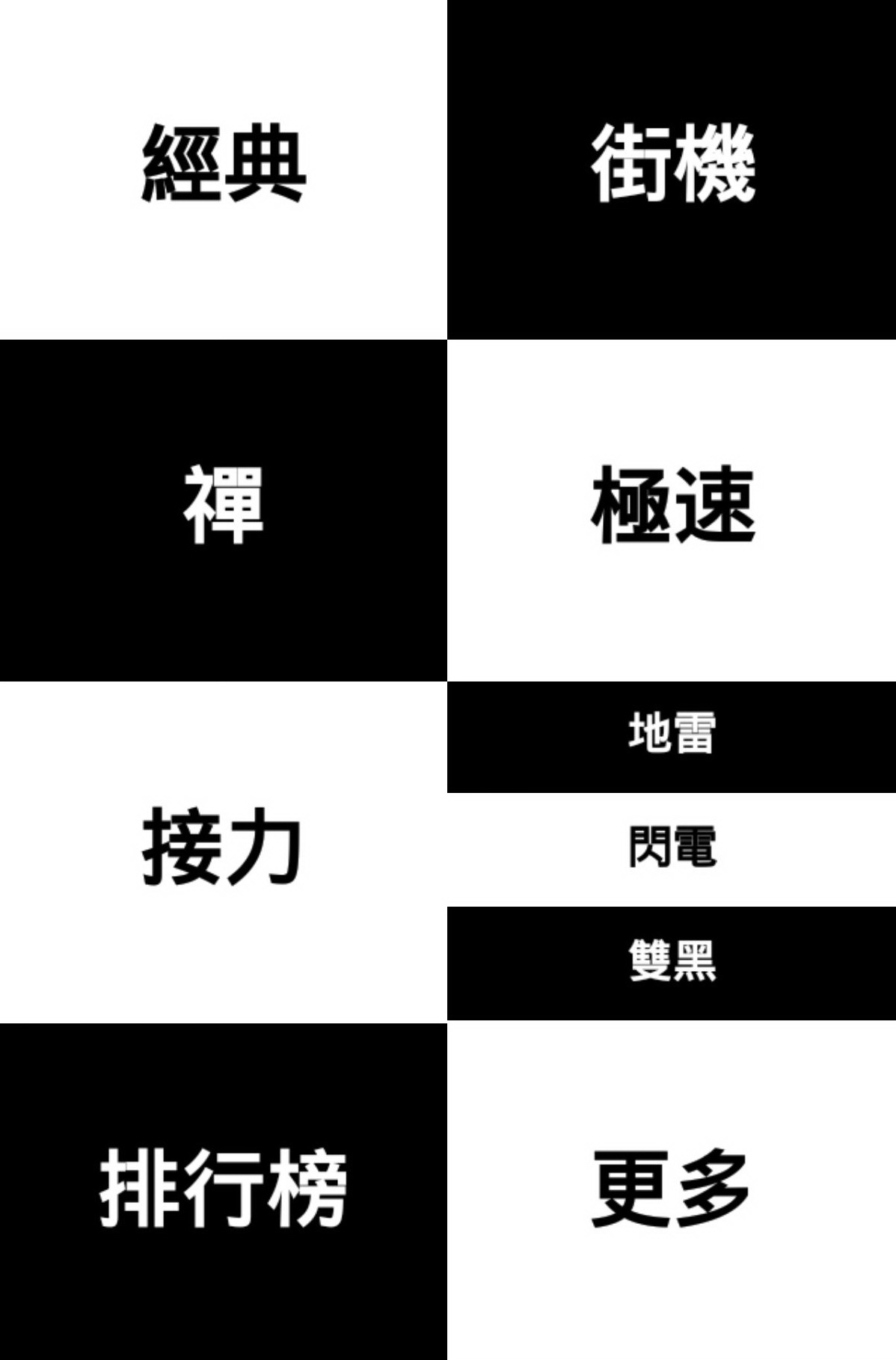 本作的畫面基調就是由黑白兩色組成,當玩家打開遊戲進入主畫面,就可以看到本作的六大主要玩法以黑白方塊的樣式排列,分別為「經典模式」、「街機模式」、「禪模式」、「極速模式」、「接力模式」與「街機+模式」。而單擊每個模式的方塊,又可以選擇該玩法下的不同時間長度、難度或是特殊規則的變化模式。