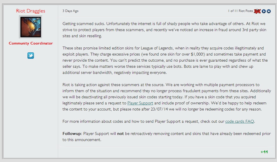 Riot 於近日在《英雄聯盟》美版官網中宣布,將撤銷所有先前釋出的造型兌換序號,以減少第三方網站詐騙。