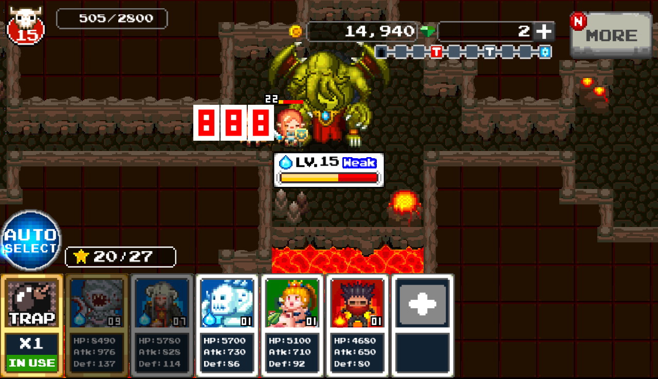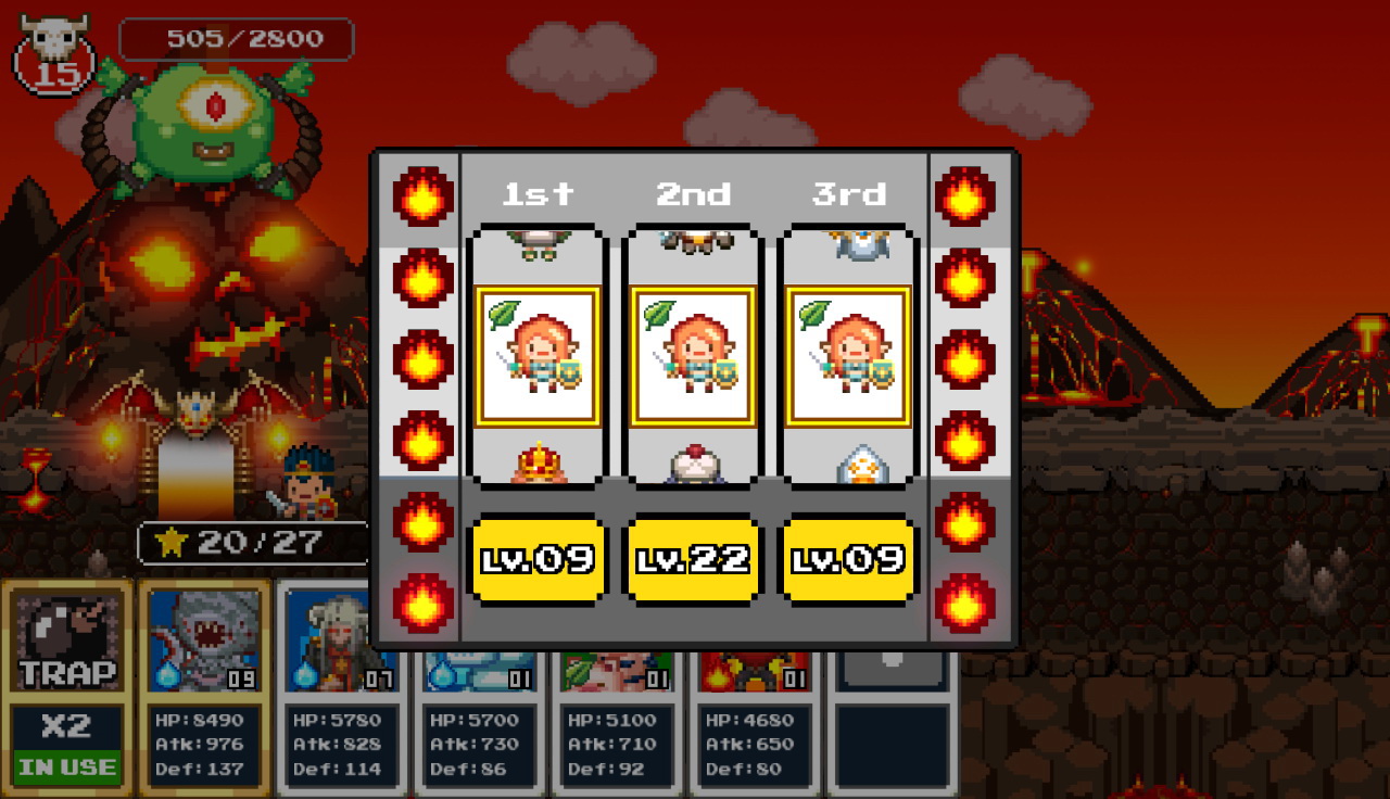 當完成準備後,玩家就可以準備迎接英雄們的侵襲。要開始戰鬥的話,首先必須拉到畫面中的拉霸,這時會隨機出現三名英雄,玩家將得在固定的回合數內擺放怪物,設法讓旗下怪物將英雄通通打回老家。