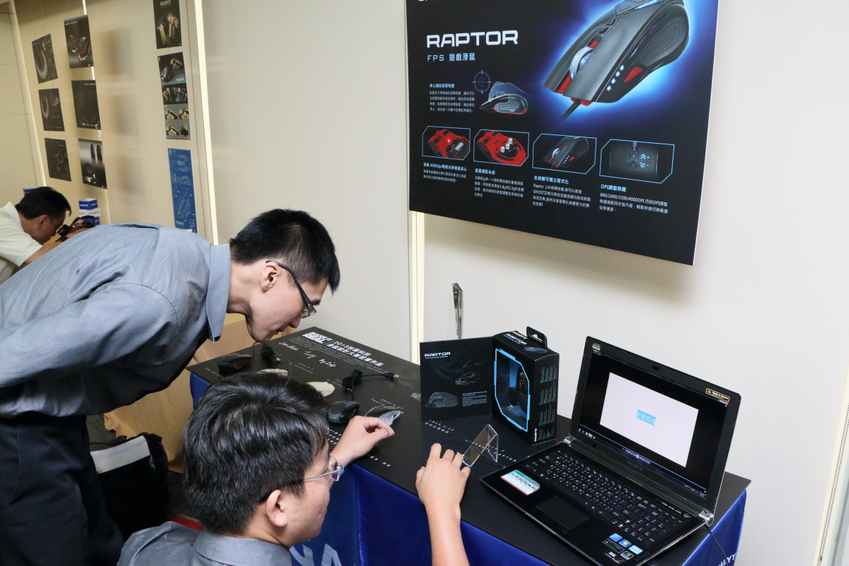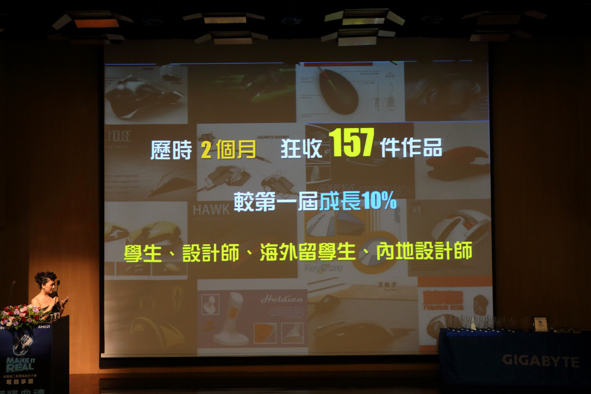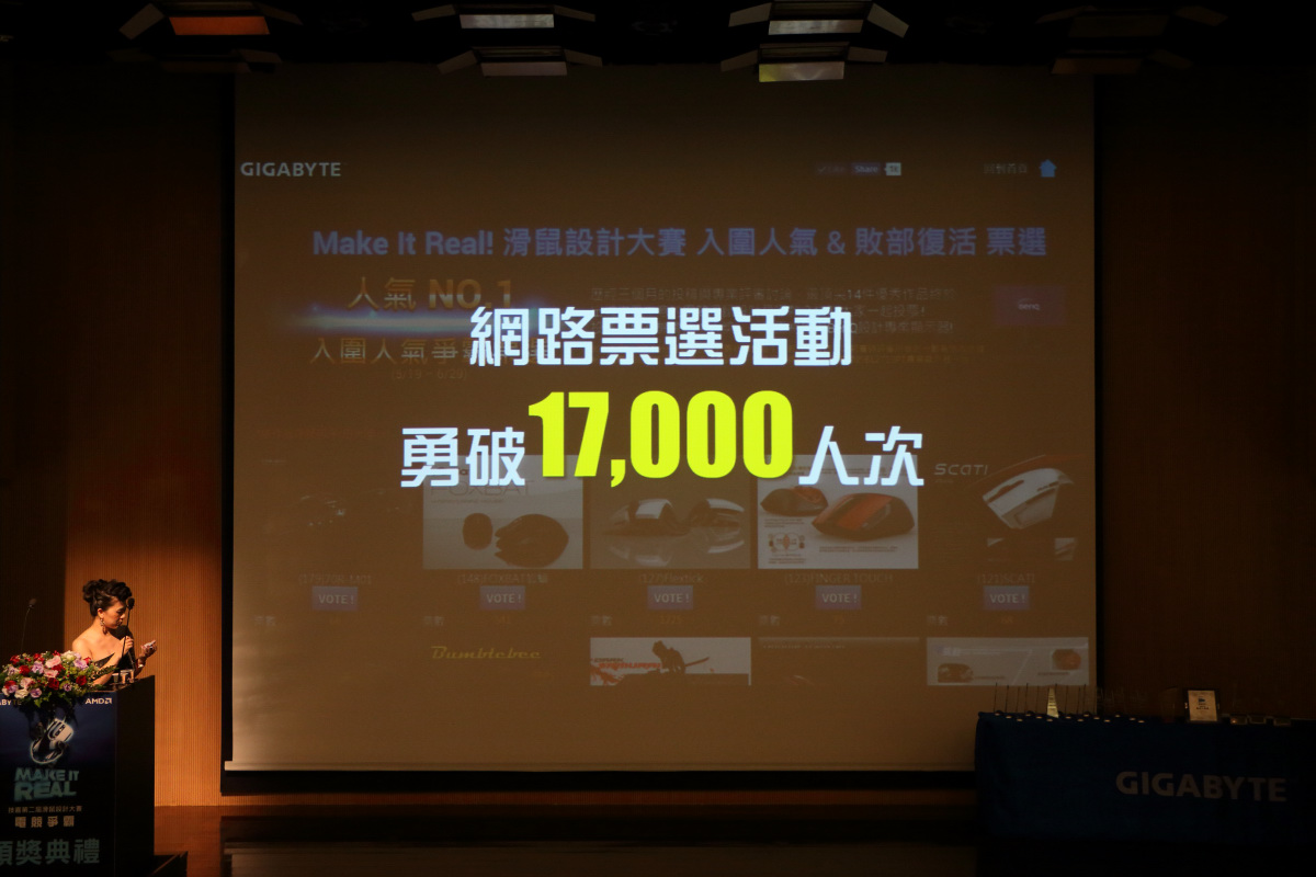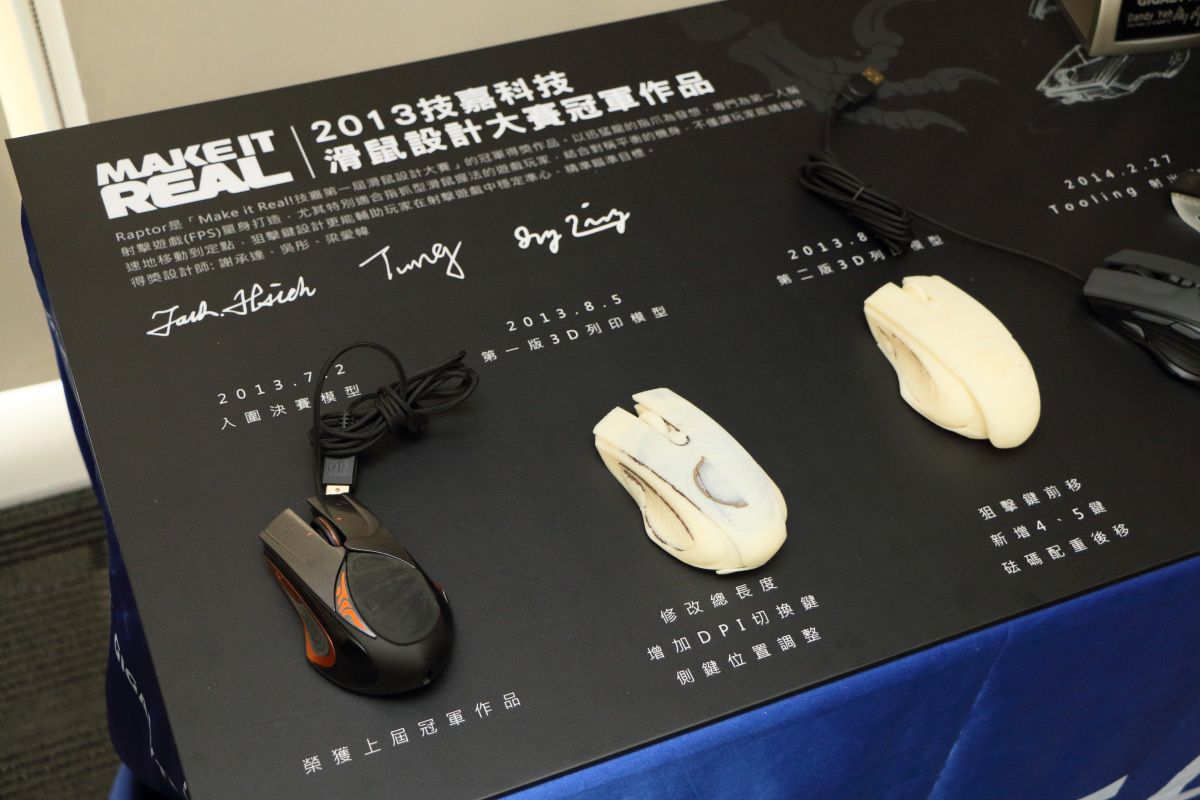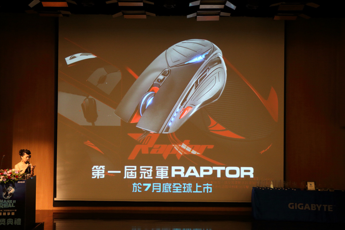 去年冠軍作品「Raptor」是由謝承達、吳彤及梁愛幃共同設計,其中謝丞達及吳彤兩人親自來到會場為參賽者打氣,還上台傳承協同量產寶座給第二屆冠軍。頒獎典禮後,技嘉科技更特別布置展覽空間,展示 15 件入選作品的介紹看板與參賽者精心打造的滑鼠模型,另外還布置了去年冠軍量產作品「Raptor」專區,讓現場的媒體與參賽者應援團共同見證「Make It Real」的里程碑。