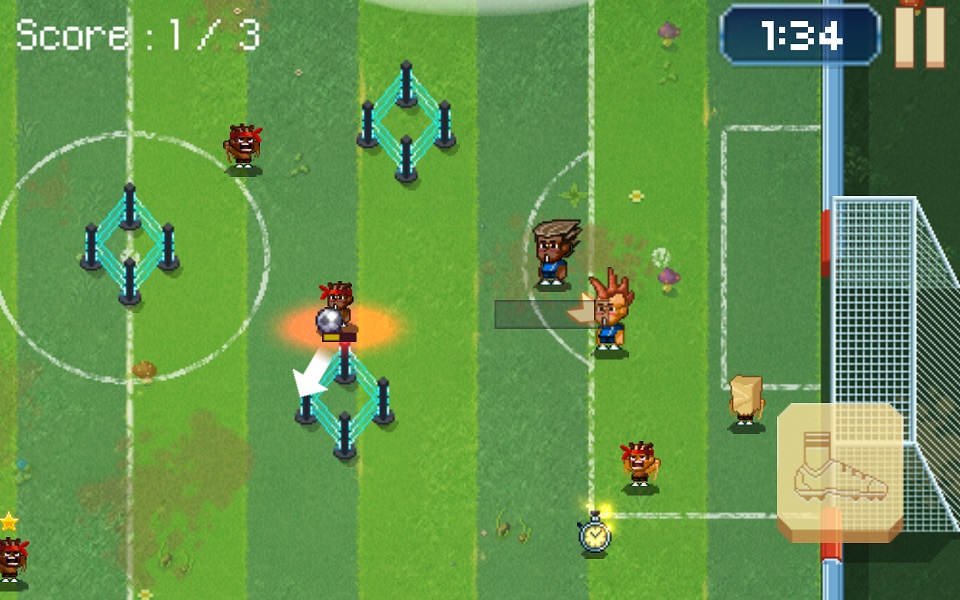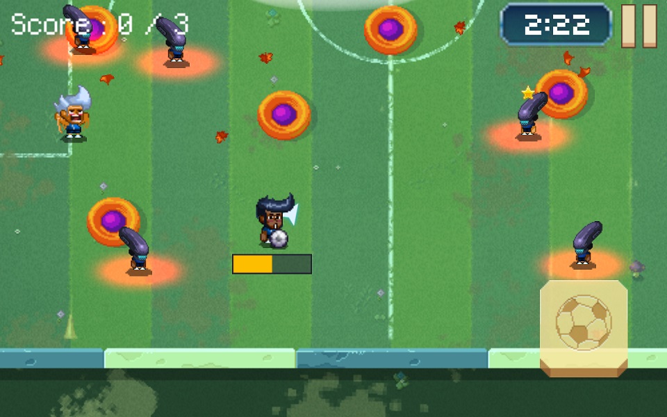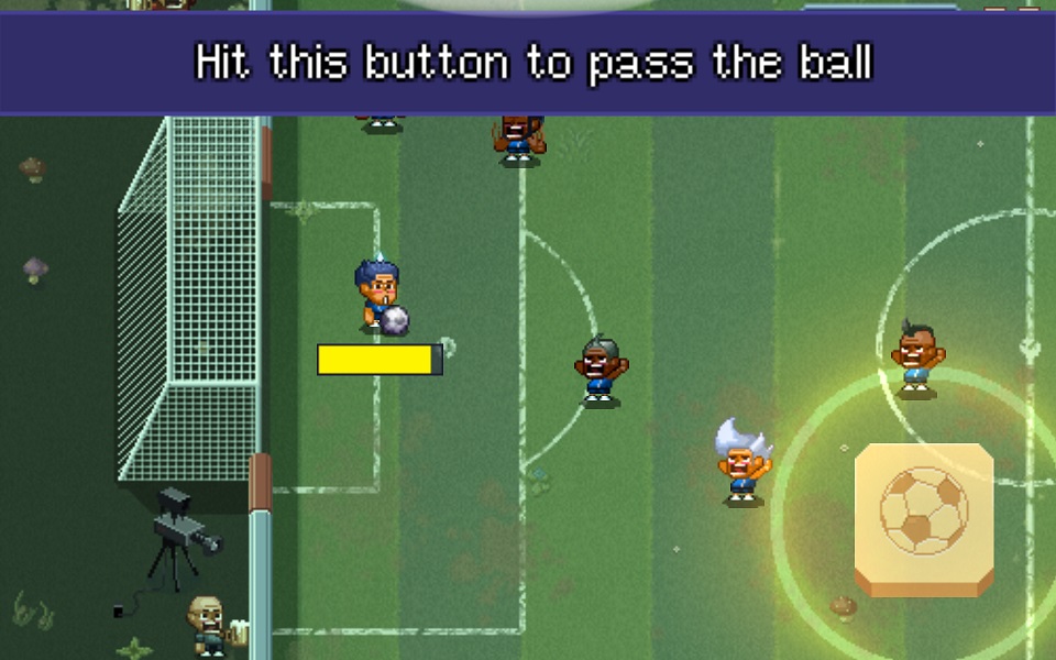 首先,在場中的球員們都會自己追著球跑,當球員搶到球時,就會進入方向選擇跟力道選擇的操作,此時球員身邊會有箭頭自動轉動,這就代表球踢出去的方向,抓好時機按住畫面右下的按鈕即可看到力道計量表會自動增減,玩家也是要看好時機放開按鈕,然後球就會踢出去了。