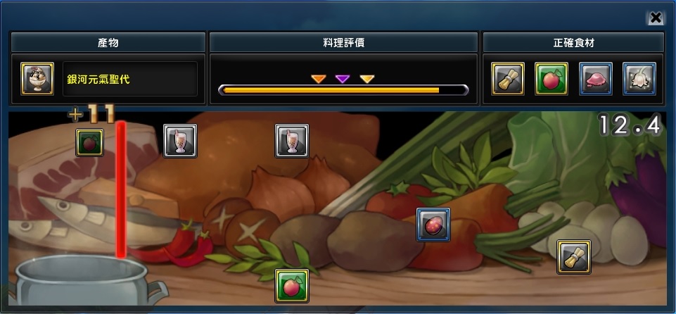 得分結果共有綠色、橘色、紫色、金色四種門檻,達到該顏色門檻就可直接得到該顏色品質的料理,像是達到橘色門檻就可獲得橘色料理,滿分還能額外獎勵最高品質料理的數量。透過「料理小遊戲」進行烹飪,就可以很方便地得到超高品質的料理喔!