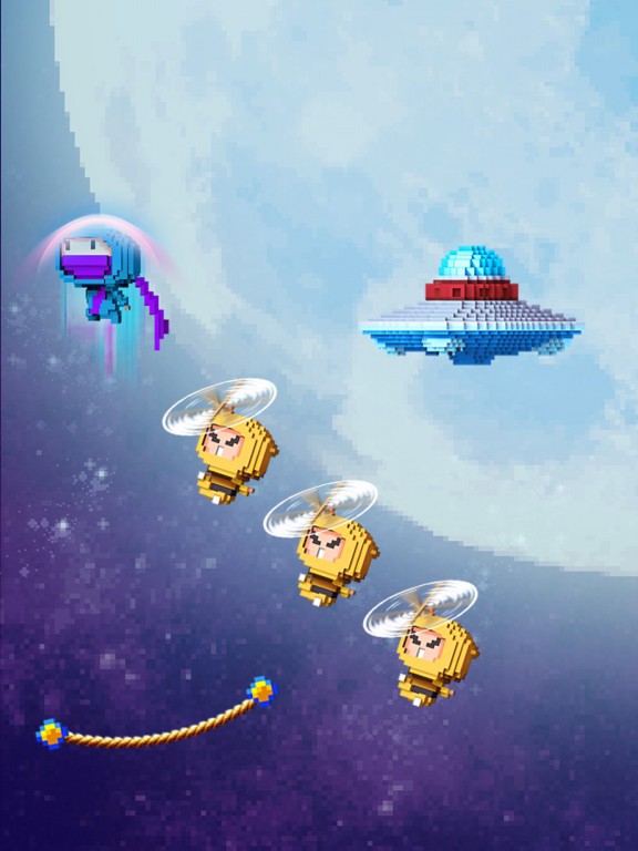 繩索愈短,彈力愈強,反之愈弱。小心翼翼地小步彈跳,還是放開懷抱一躍登月?四處彈跳的同時,緊記閃開敵人和障礙物:飛行忍者、 UFO、鋼筋。玩家可以挑戰好友,比拼分數。遊戲使用像素化經典設計,玩法簡易上癮,帶給玩家新鮮的休閒體驗。