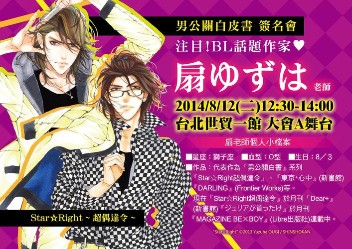 創造出《Star☆Right ~ 超偶達令 ~》、《男公關白皮書系列》等暢銷著作的BL系漫畫家.扇ゆずは老師確定將於今年八月的漫畫博覽會首次來台舉辦簽名會囉!男公關系列有別於一般唯美的故事劇情,許多角色都很硬派,壞的讓人傾心不已。喜歡男公關等系列的朋友們,請別錯過與扇老師相見的機會!