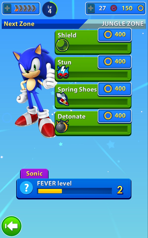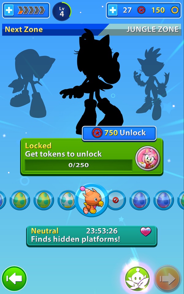 而遊戲中也有其他角色可以選擇,但都必須花上點時間來解鎖才行,所以一開始只能使用「塔爾斯」來進行遊戲。不用太久的時間玩家應該就可以解開主角「索尼克」來遊玩了。當然不同角色也有不同的技能,而每次升級能力時,都會增加進入金環狂熱的時間,而這狂熱時間是共用的。至於其他角色,或許得靠付費要素來解鎖了吧。