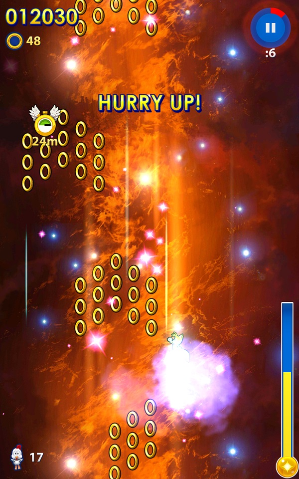 雖然說本作就算失誤也不會讓遊戲結束,但會因此減少幾秒鐘,所以想要獲得更多金環的話,還是儘量避免失誤吧。而連續打倒敵人或到達特定地點時會形成 COMBO,COMBO 越高就可獲得越高分。在獲得金環時,畫面右邊的計量表就會慢慢上升,到達最大值時就可進入金環狂熱時間。