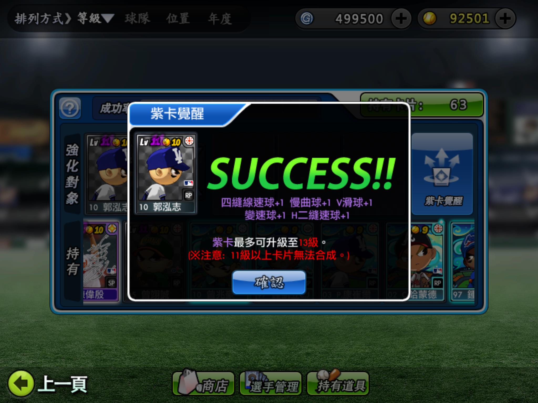 紫卡在升級為黑卡前,要選定3張「白金卡」等級以上的球員卡片進行合成!