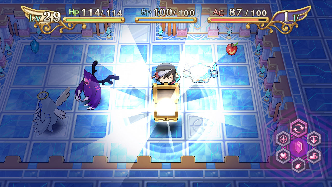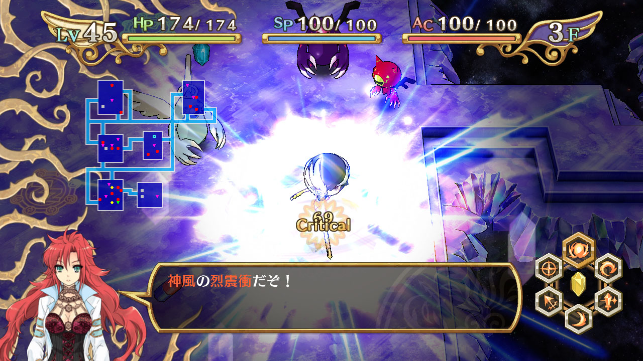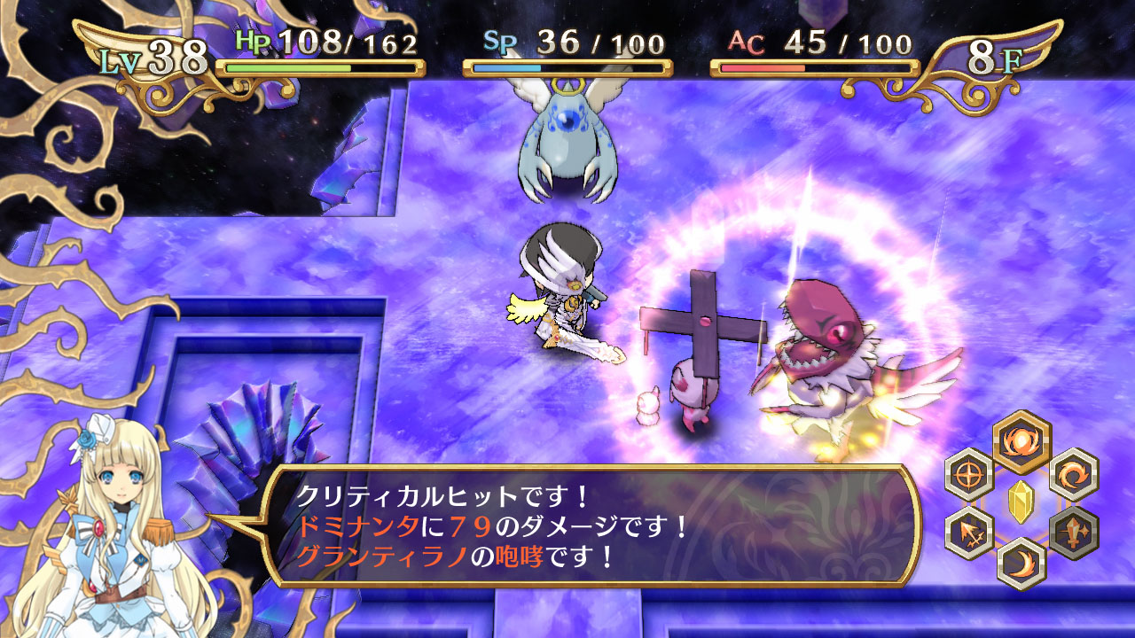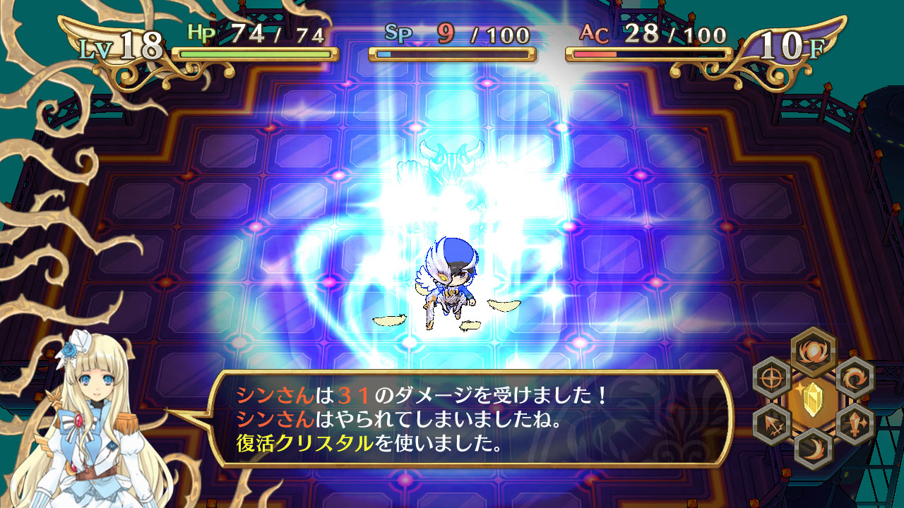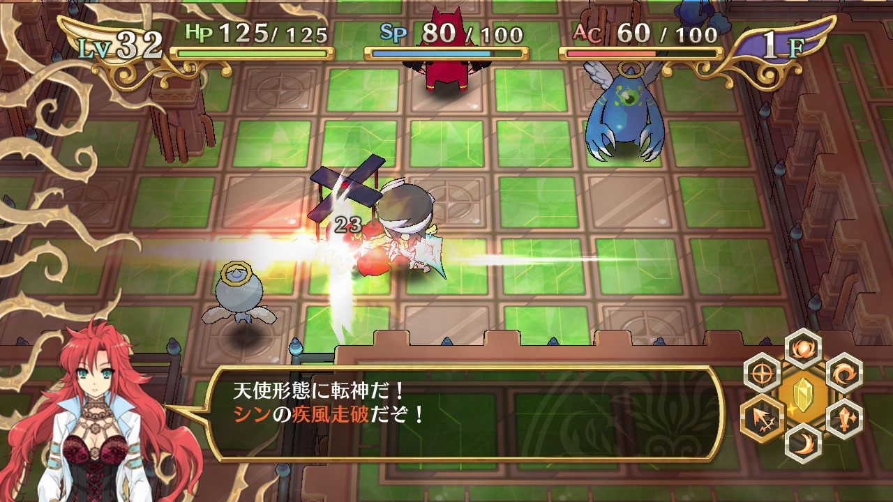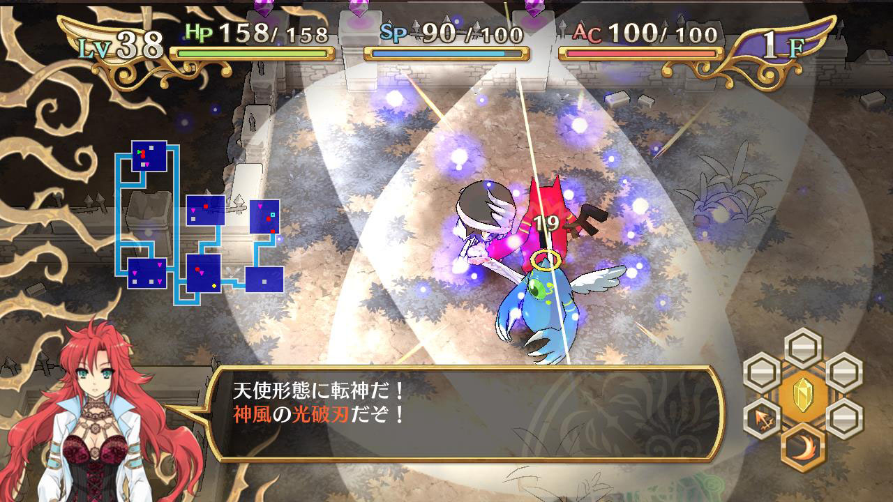 這次公布的是,身為主角的神風真將挑戰探索的迷宮的詳細情報。在本作品裡的迷宮,採用於每次進入時都會改變其構造的設計,迷宮內部有著多樣化的敵人及陷阱等待著玩家。此外,敵人由於有著善與惡的屬性設定,因此在攻略時任意轉換為天使與惡魔的「轉神」的使用方式,將是左右著戰鬥的關鍵。此外,將裝備品賦予技能結晶,使其能力獲得提升也是十分重要的。