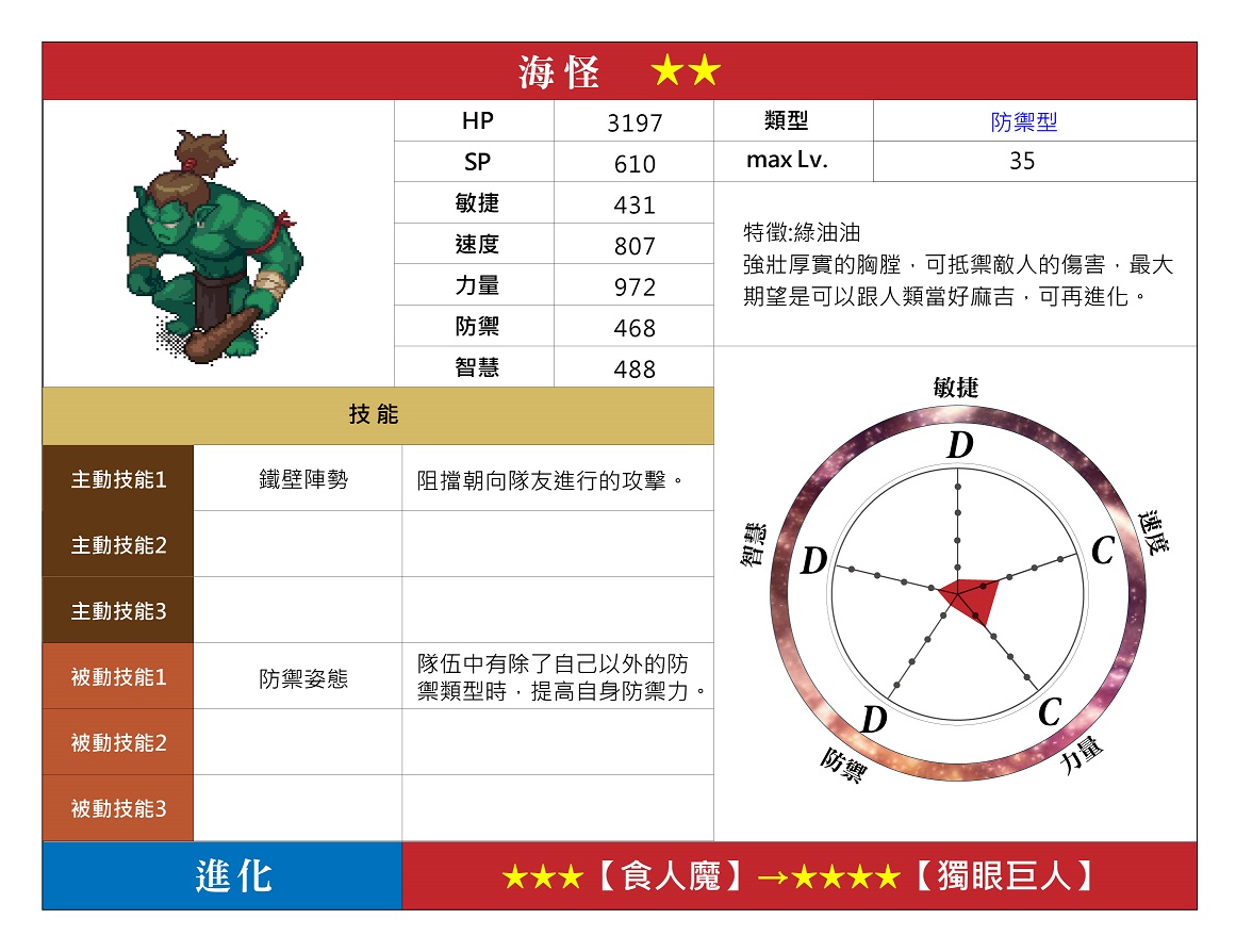 遊戲中內建百款人類、怪物傭兵,合計擁有 300 多種技能;因傭兵屬性種類不同,進化的階段也有所差異,遊戲中可使用各屬性的鑽石練等升級傭兵,而升級為等級上限的傭兵可透過組合材料進化,每次的合成過程皆會改變角色外觀,不可預期的進化外型,企圖帶給玩家驚喜與期待。