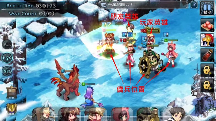 在玩家的隊伍中共有六個位置,其中玩家英雄為一個英雄位,玩家的朋友英雄為另一個英雄位,光是兩個英雄位的隊長技搭配便有 324 種組合,而剩下四個傭兵位,更是有多達上萬種組合可供玩家調配。前後排的位置,傭兵本身的屬性,手動技能施放的時機,都會影響到整個戰局。英雄若是一個隊伍的方向盤,那麼傭兵便是車輪,玩家的隊伍是否能在各種不同類型的戰鬥挑戰之路上披荊斬棘,傭兵是絕對不可或缺的存在。