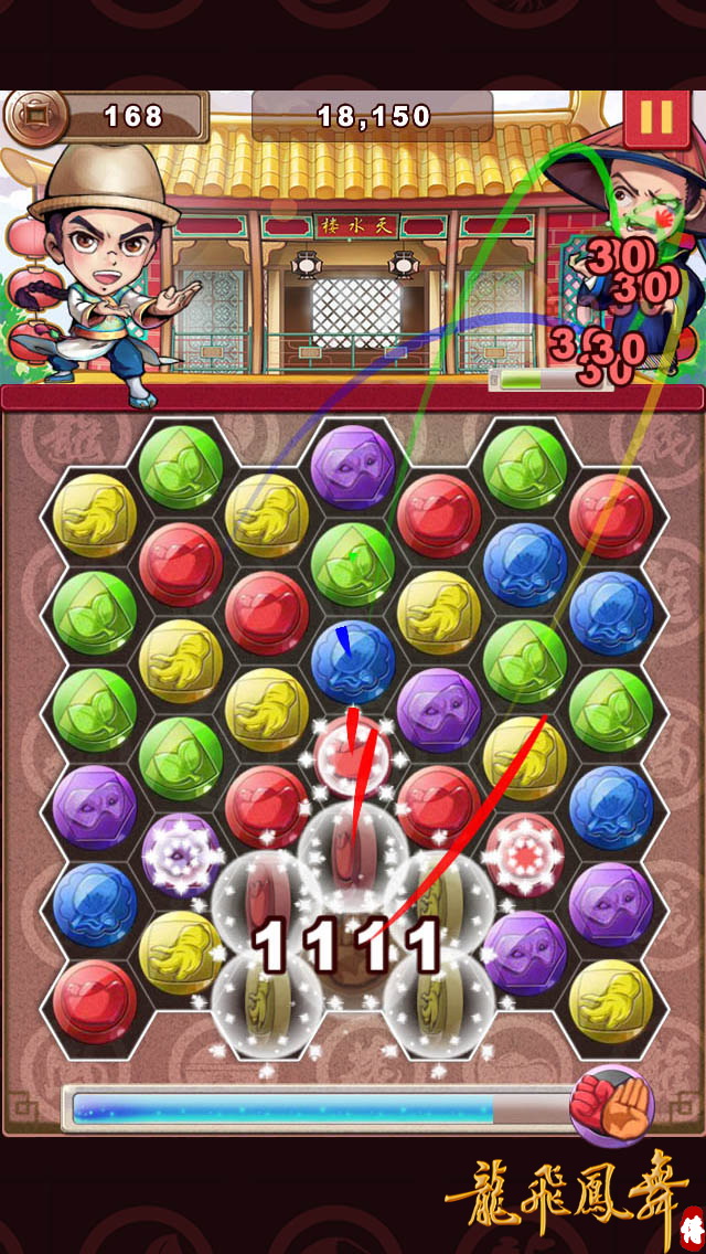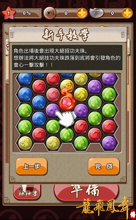 龍飛鳳舞傳》為一款老少咸宜的益智三消遊戲,遊戲方式簡單容易上手,只要將相同顏色的珠子連成一線,即可將他們刪去並獲得分數,與一般益智休閒游戲不同的是,在消除珠子的同時,有機會出現特殊的功夫珠,點擊後可瞬間消除四周珠子,且遊戲中隨機出現的大絕技功夫珠,只要想辦法讓它掉落至畫面最下方,觸發狂暴模式,搭配上華麗的聲光效果,喜愛益智休閒游戲的你絕對不能錯過!