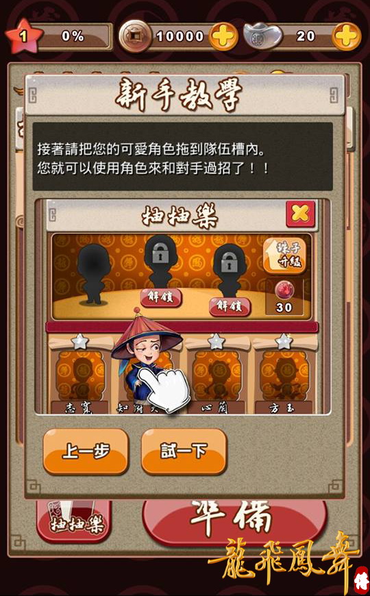 龍飛鳳舞傳》時,系統會開啟簡易的新手教學功能,帶領玩家體驗遊戲中的大致玩法及功能,其中還有免費首抽的機會等著玩家,有機會隨機抽到極稀有演員於遊戲開始就陪玩家一路過關斬將,現在就立刻下載,與知名演員們一起同遊於《