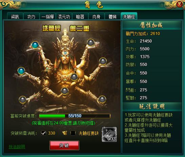 洗髓經每提升一個階數 則可獲得大量屬性加成