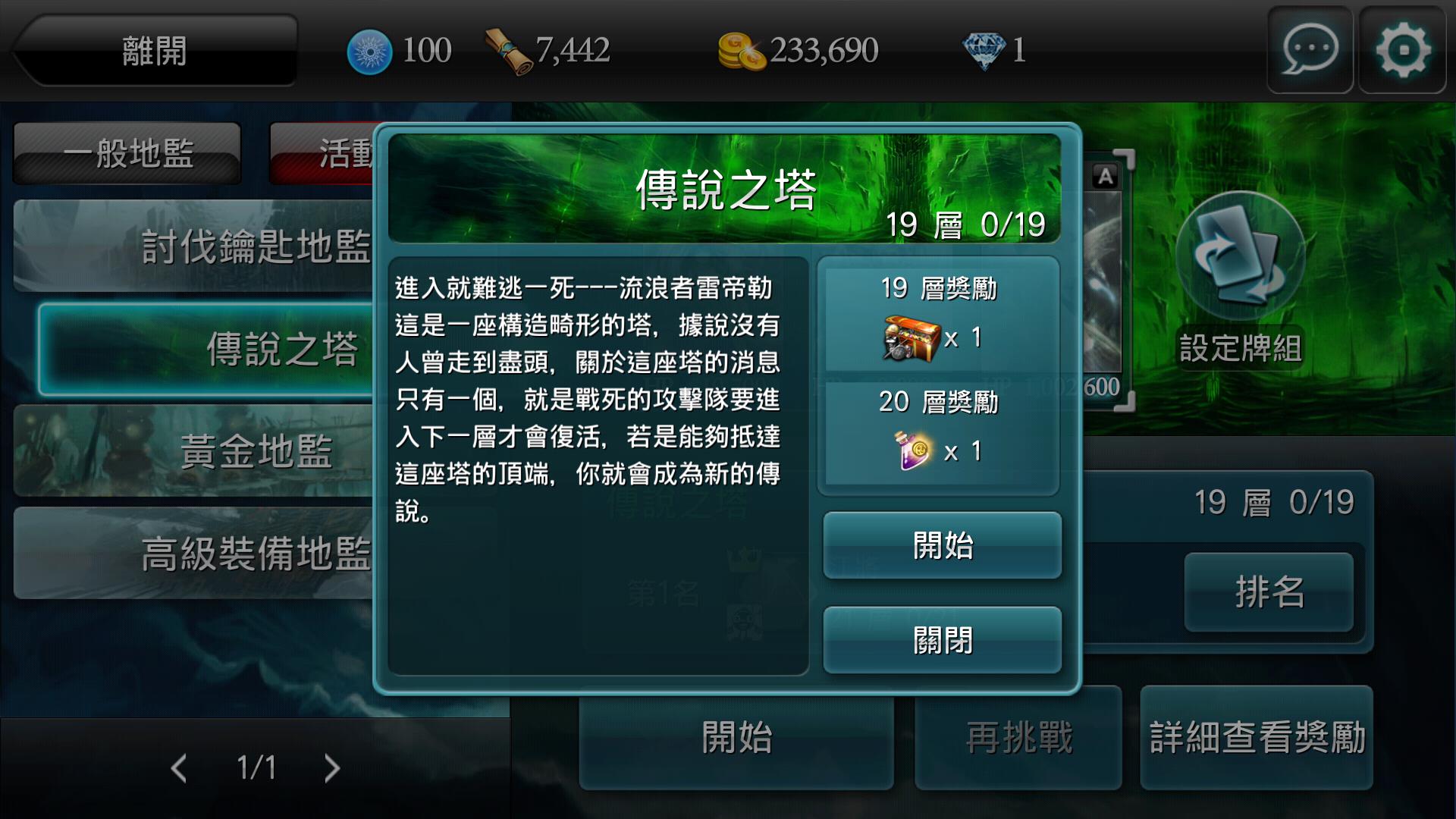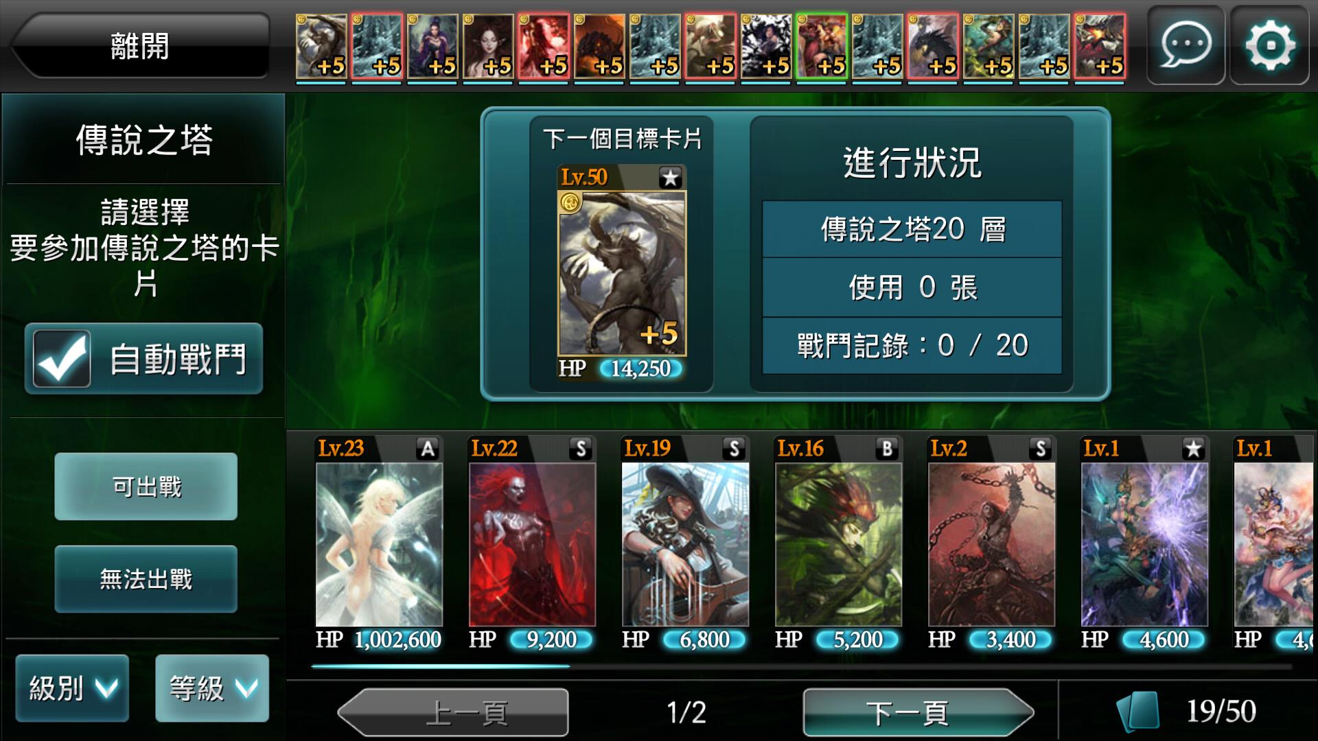 玩家進入「傳說之塔」後,可以看到該層樓的魔獸資訊,以及自由選擇要出戰的卡牌!