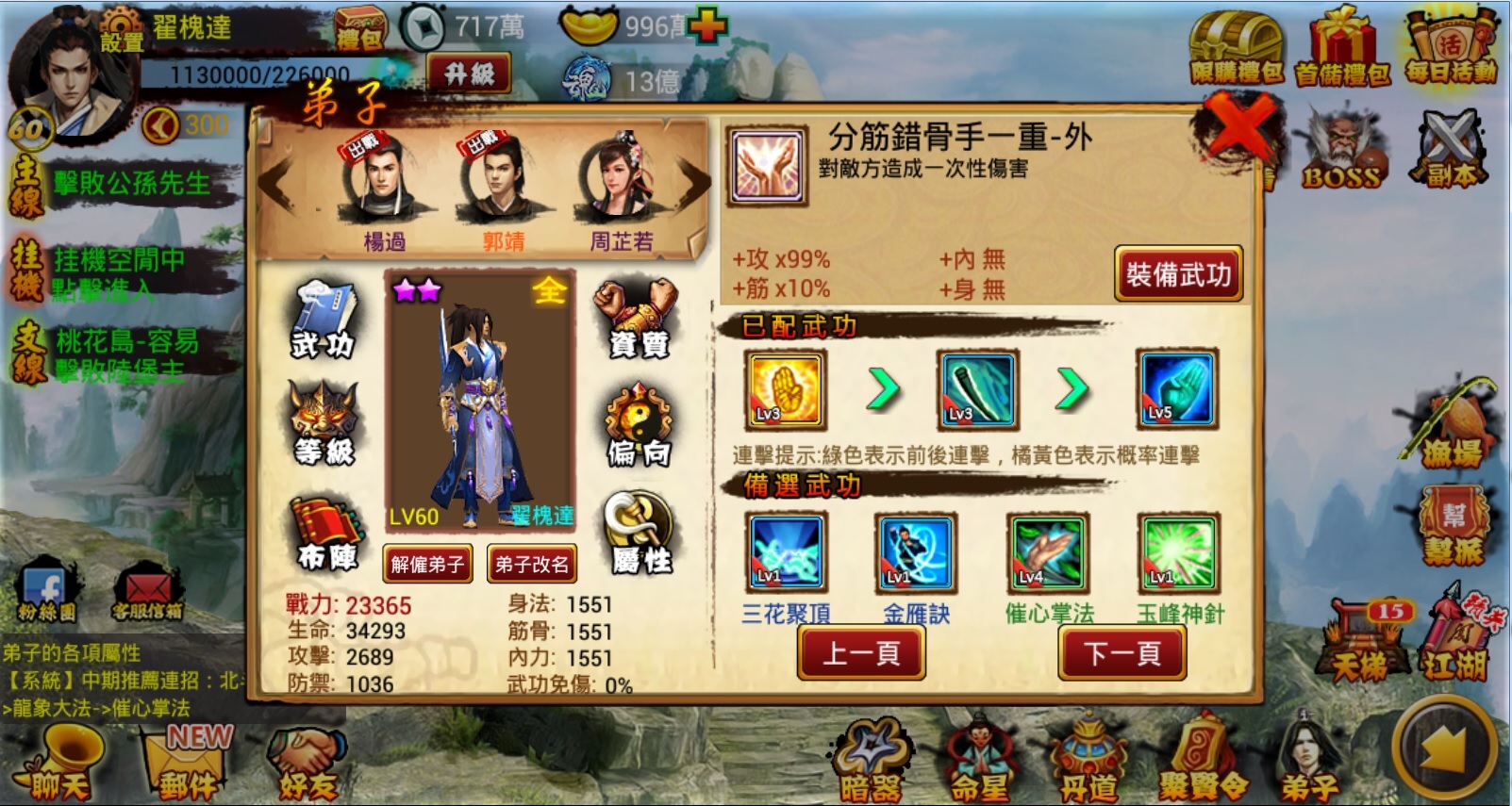 弟子有分成六種屬性特性,包含「攻擊、防禦、生命、內力、身法、筋骨」,屬性將影響弟子的成長素質。