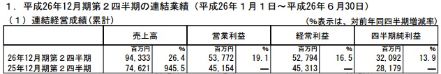 《龍族拼圖(Puzzle & Dragons)》開發商 GungHo Online Entertainment 正式對外公布了 2014 年第二季財報的財務報告。銷售額比去年同期比較增加了 26%(943 億日圓,約 268 億台幣),經營收入增加 19%(537 億日圓,約 152 億台幣),稅前純益增加 17%(527 億日圓,約 149 億台幣),而純利益則是增加了 14% (320 億日圓,約 91 億台幣)。