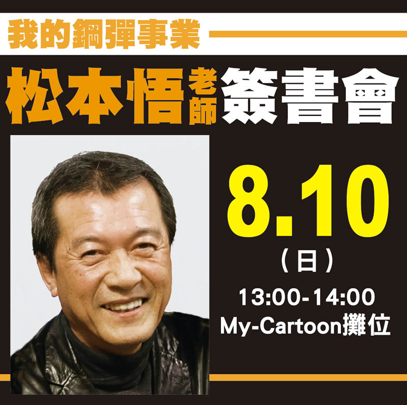 群英社宣布,將於漫博期間邀請,曾任職於 BANDAI、SUNRISE 等企業,與「鋼彈」有厚淵源的現任日本動畫協會專務理事暨事務局長 松本悟 ,在 8 月 10 日下午 1 點於群英社 MY CARTOON 活動舞台舉辦個人首場簽書會。