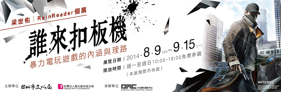 台北數位藝術中心將於 8 月 9 日至 9 月 15 日舉辦梁世佑 RainReader 個展「誰來扣板機:暴力電玩的內涵與理路(Who Pulled the Trigger: The Connotation and Context of Violent Video Games)」,以多元的角度與觀點來介紹何謂「暴力電玩」。