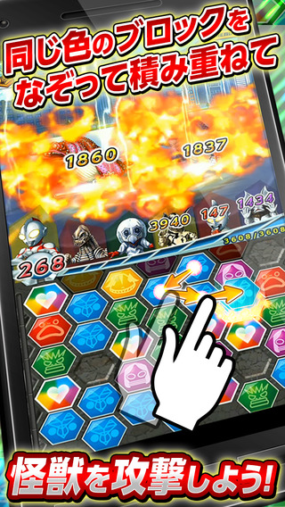用判斷力跟速度決勝負,而且操作很簡單!只要用手指將同樣顏色的圖案拖曳過去連接起來就好。連接起來的圖案消除後,會根據所消除的顏色來讓超人力霸王或怪獸攻擊對手!只要在限制時間內消除許多圖案的話就會發生連段!能夠給予的損傷也會變更多!瞬間判斷紅・藍・綠・黃・紫五種顏色的圖案來打倒敵人吧!