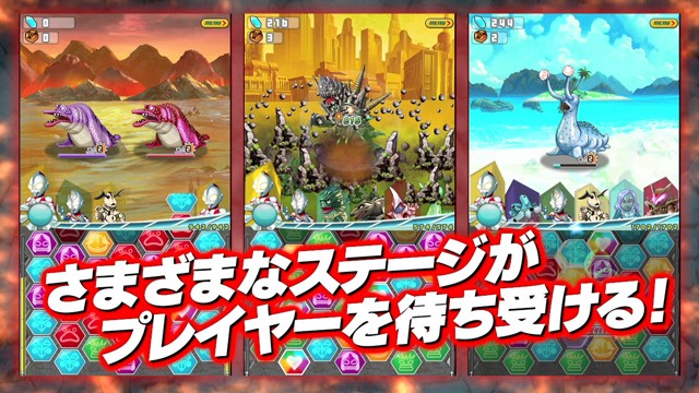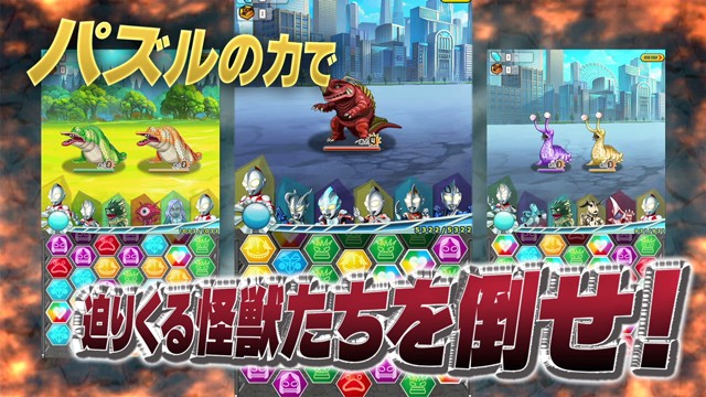 歴代超人力霸王英雄與怪獸,運用 5 種顏色的圖案來進行連鎖的爽快戰鬥開幕了!現在就拿起手機來遊玩吧!