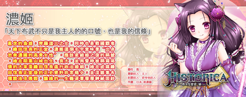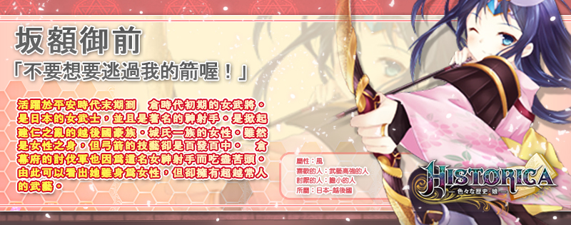Historica》多變世界風的「歷史娘」囊括了歐亞非大陸,匯集來自中國、日本、印度、埃及、英國、法國、西班牙等世界各國,官方今日首度揭露日本王女坂額御前和濃姬兩名萌將資訊,讓玩家一睹「歷史娘」淨化風采。