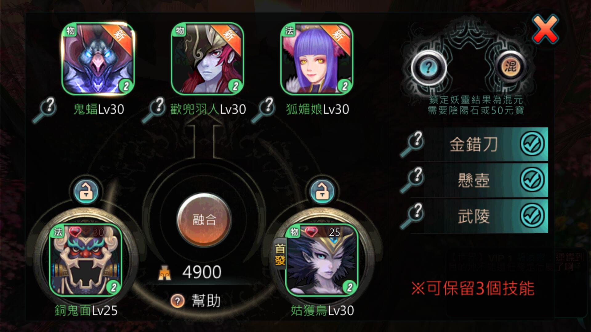要進行妖靈合成時,要注意親密度
