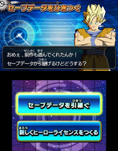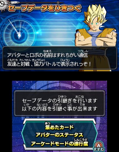 可於任天堂 e-SHOP 裡,下載繼承遊戲資料 APP!!能夠繼承在前作《七龍珠 究極任務》裡所取得的卡片、培育分身角色的能力值、大型電玩模式的進行度等資料。在前作中的努力絕不是白費工夫喔!確實繼承資料來擴大與朋友之間的差距喔!!