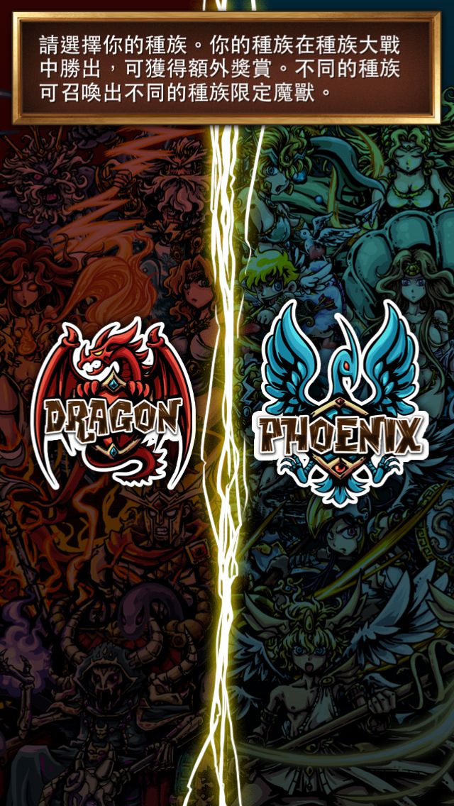 首次進入遊戲時,玩家可以根據自己的喜好來選擇種族 -「龍族之後」或「鳳凰之裔」,兩個種族均有各自的限定魔獸,需要注意的是,種族的選擇還會影響到後續種族大戰 -「亞穆斯之戰」的結果喔。選好種族之後,會進入一個召喚的畫面,玩家把魔法石放進魔法陣內,便能召喚出初始的魔獸了。