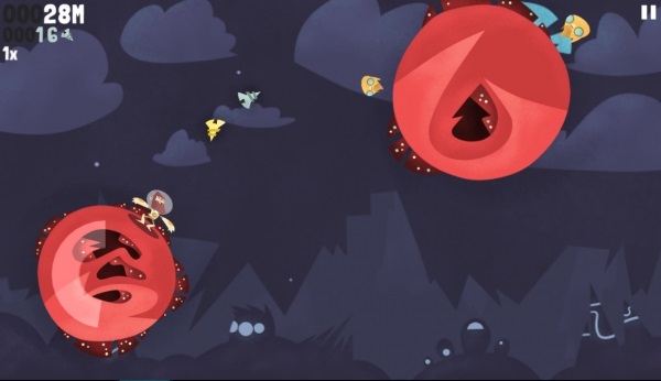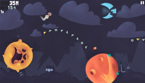 在星球之間,有時候會出現飛來飛去的隕石,若是被隕石給撞上了,其下場就是跟迷失在宇宙中一樣 Game over。說到應付隕石的方法,遊戲中有一個沒有明說的小技巧-當玩家按住螢幕時,主角並不會立刻跳躍,而是會在當前位置待機(連星球都停止轉動了!)因此只要看準隕石飛過的時機再放開手指、進行跳躍,就可以輕鬆地避開隕石了!