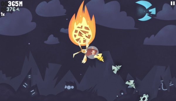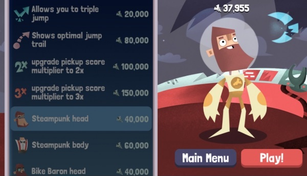 當收集到足夠的零件後,就可以回到太空船上修理船…噢不,是購買特殊能力與服裝。本作提供了數種能力供玩家選擇,像是增加跳躍速度、增加一段跳躍、分數加倍等等;服裝則分為頭部與身體,共有蒸氣龐克以及從 Bike Baron 來客串的機車男爵兩種造型。而在特殊能力之中,筆者認為最棒的應該算是「顯示跳躍軌跡」這項功能吧!不過八萬點的價格…筆者還有好長一段路要走哪。