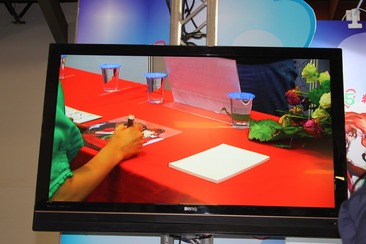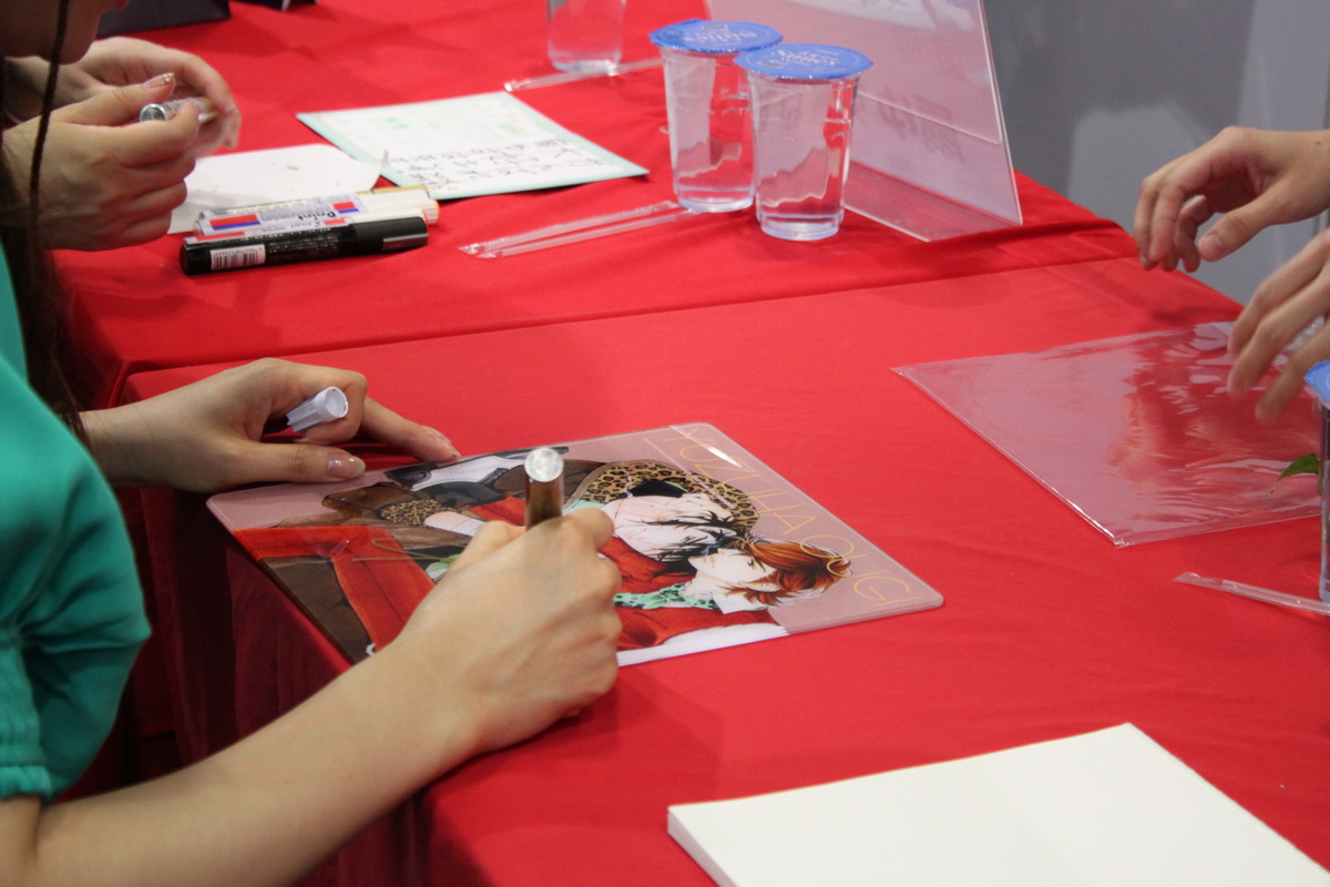 而由於老師十分害羞,禁止讀者以及媒體拍照攝影,因此出版社特別在舞台上打造出大型布幕隔間,並且架設攝影機作即時轉播,只有幸運獲得簽名資格的讀者才有機會一睹老師風采,儘管如此,現場還是湧入數百名讀者的熱情參與,更有讀者們自己親手製作了應援物,還準備了禮物、卡片要送給老師。