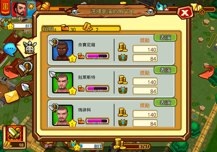 聲望這麼重要,那麼一開始要如何快速提升呢?在角鬥士還不熟悉如何操控,個人戰役可能打不贏的情況下,最快速的方法便是「表演賽」。讓角鬥士參加表演賽除了可獲得些許金幣外,更重要的是可取得大量聲望,只要多參與幾次,相信玩家們很快便可達到聲望 5 級了。雖然參與表演賽的過程中,角鬥士會消耗大量的體力,看似非常的不值得,不過由於聲望等級提升後,角鬥士將會恢復些許體力(加 30 體力),因此也不用擔心角鬥士體力不足的情況喔!