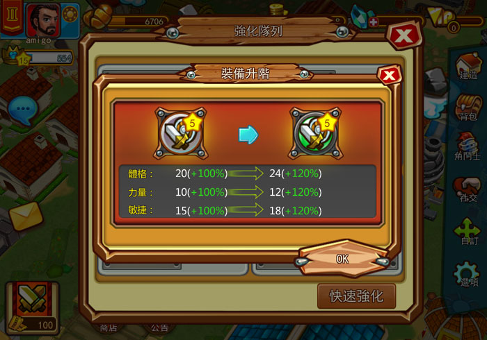 於角鬥士的部分,遊戲中另設有「進階」系統,當角鬥士裝備升到極限後,可透過進階系統把原有裝備進行升階動作。進階後的裝備不僅能力上有突破性的成長,還可繼續提升全備的等級,打造更強大的角鬥士。裝備進階時需要些許材料,這部分玩家可透過精英副本來取得。