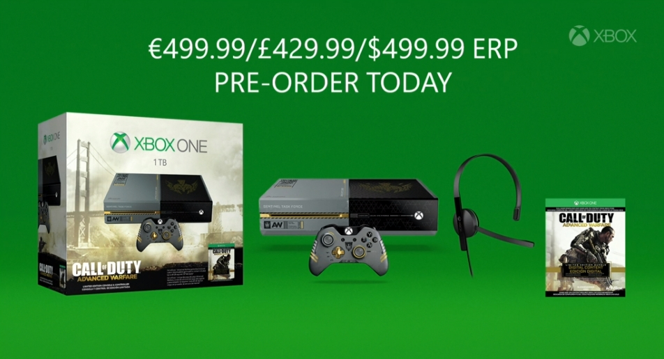 微軟於歐洲最大遊戲展 Gamescom 開展前一日,舉辦全球媒體展前發表會,並且在會中宣布《決勝時刻:先進戰爭(Call of Duty: Advanced Warfare)》,將會和遊戲同步於 11 月 4 日推出同梱版 Xbox One 主機包裝。主機本體將會施以獨特的灰 / 黑 配色,手把的部分也是以灰色為主體來構成。而硬碟部分則是內含 1 TB。即日起開放預約,並且售價訂為 499.99 歐元,