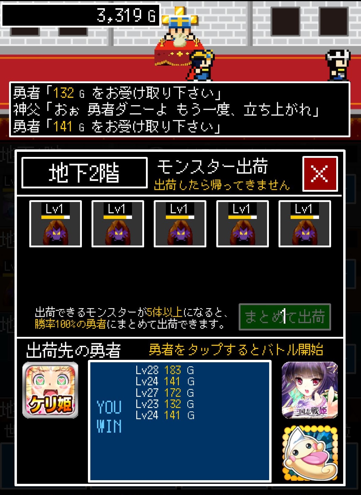 當玩家在同一層擁有 5 台生產機以上的話,就可以讓所有魔物一次全部出動去打可 100% 獲勝的勇者,不過如果魔物等級太低,就只能打等級低的勇者了,低等勇者就是窮啊!所以賺不了什麼錢,所以生產機有強化過的話,魔物們能夠 100% 獲勝的勇者等級也會提高,相對的就可以賺更多錢了。而魔物出擊之後等級也會歸 0,必須重新等待。