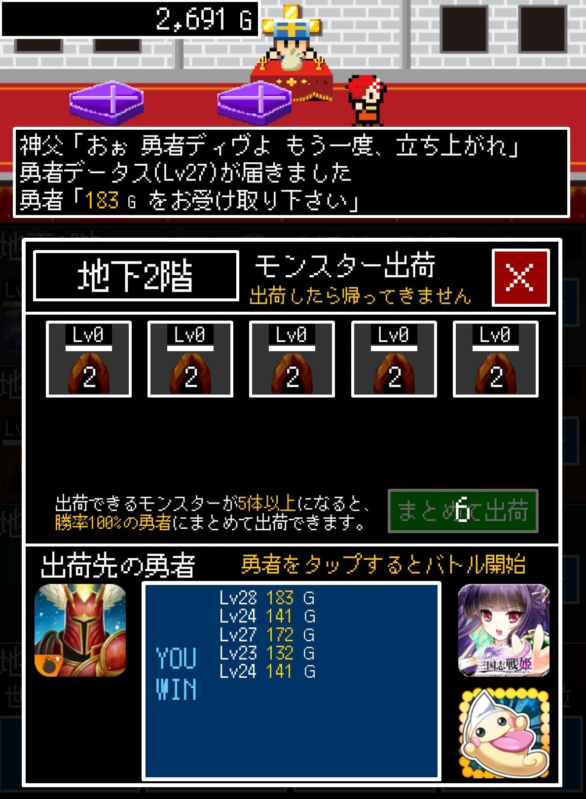 魔物等級低的話,能夠 100% 獲勝的勇者等級也很低,只能賺幾塊錢