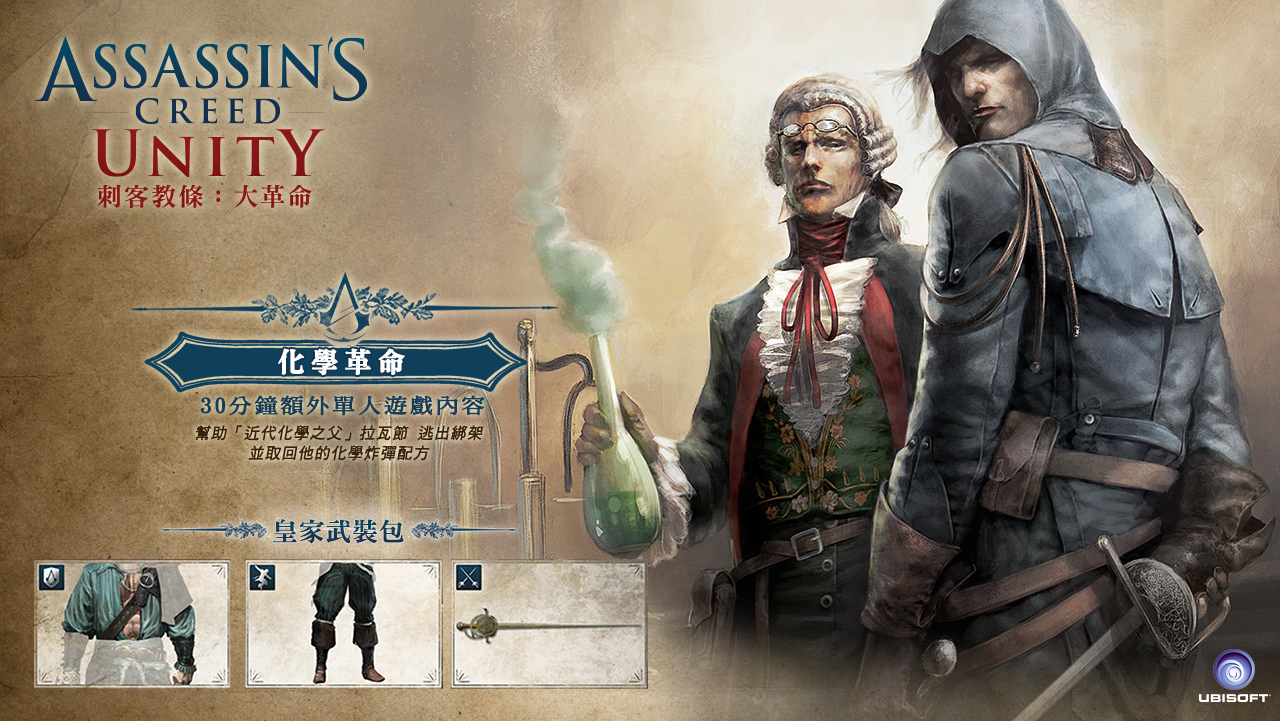 Ubisoft 昨日在德國科隆舉辦的 Gamescom 展前發表會上,揭露了《刺客教條:大革命》最新「巴黎天際線」遊戲預告片以及法國巴黎遊戲場景地圖;在今起一連五天的 Gamescom 電玩展期間,Ubisoft 也將於現場獨立攤位實機展出最新遊戲內容。官方同時宣布,首批中文版將會全面升級為特別版,追加「化學革命」在內 30 分鐘額外單人遊戲內容、幫助近代化學之父拉瓦節逃出綁架並重新取回化學炸彈配方。