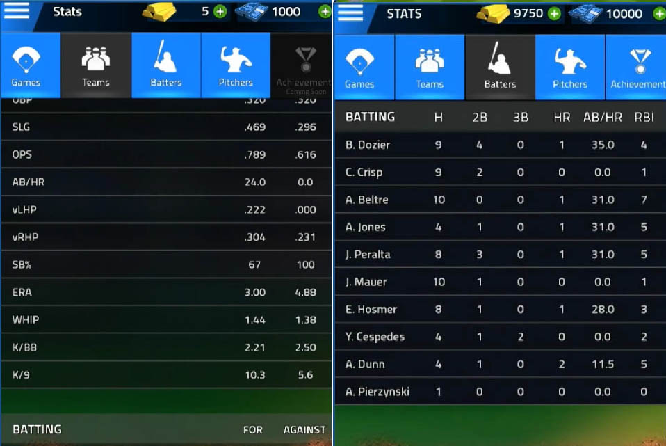 棒球大聯盟》也非常完整,包括球隊總戰績、勝率、個人戰績、左/右打者、以及玩家個人積分…等全能忠實紀錄,且遊戲也會依據球員真實數據給予精確的即時建議。