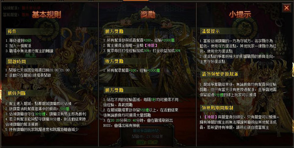 不管最終戰鬥結果如何,所有參與的幫派成員都可以獲得一定數量的幫貢和經驗。而獲勝方的所有幫眾每日還可額外獲得打怪經驗加成和打坐收益加成,同時其幫主將成為實至名歸的「龍皇」,並獲得全服唯一的、象徵著無上榮耀的坐騎「神龍」!