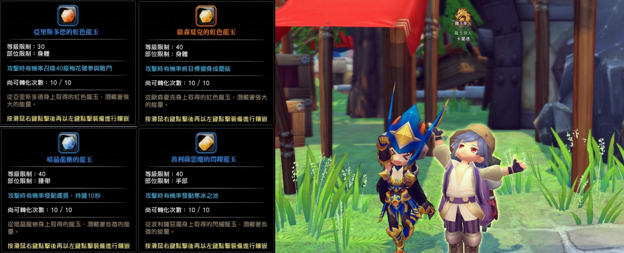 遊戲中「龍玉」的取得來源,除了打倒龍獸的掉寶之外,玩家初始也可以從商店買到一般通用的「龍玉」。如果持續累積特定聲望,還能跟聲望商人購買稀有又強力的「龍玉」!