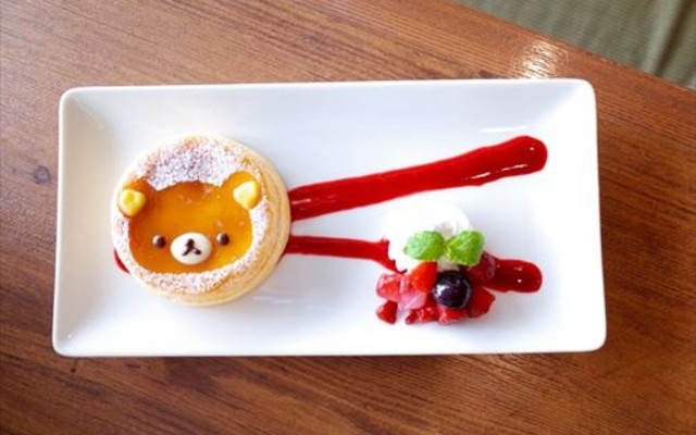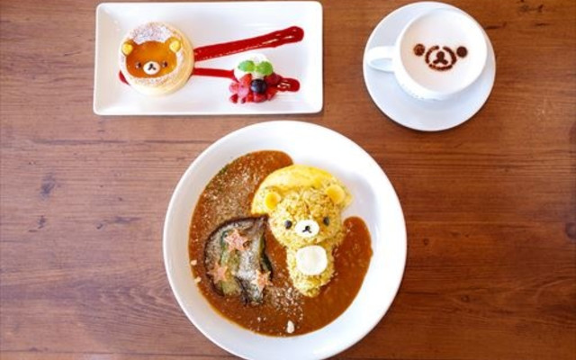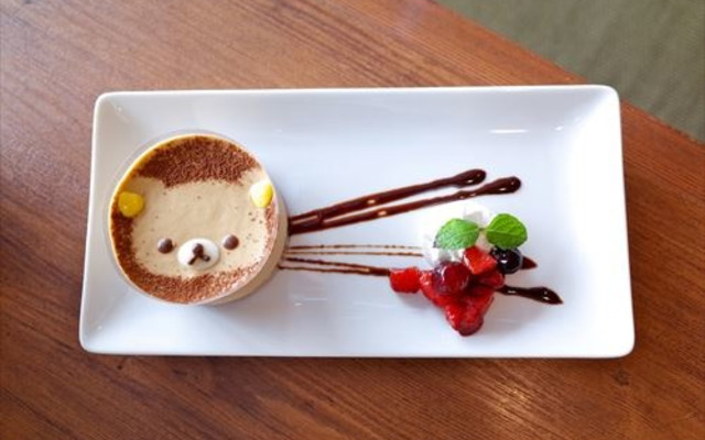 現在開始,讓我們看一下咖啡廳的原創菜單。主食只有一道:「懶懶熊咖哩」( 1500 日圓含稅)。甜點則有兩種:「懶懶熊焦糖慕斯」(含飲料 1450 日圓含稅)以及「懶懶熊烤杏仁起司蛋糕」(含飲料 1500 日圓含稅)。