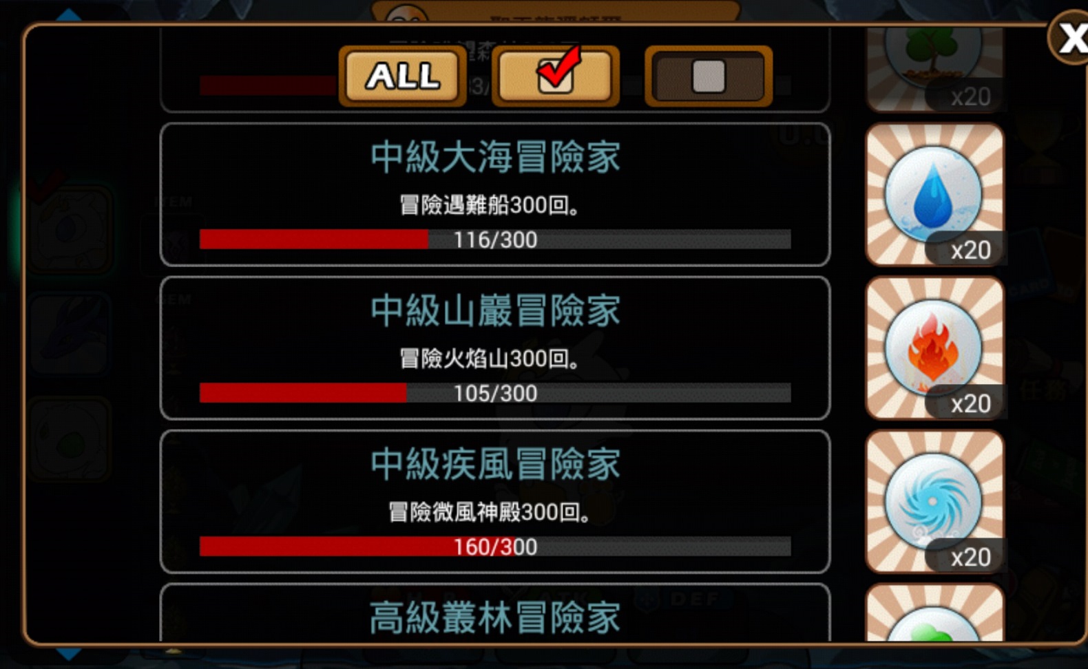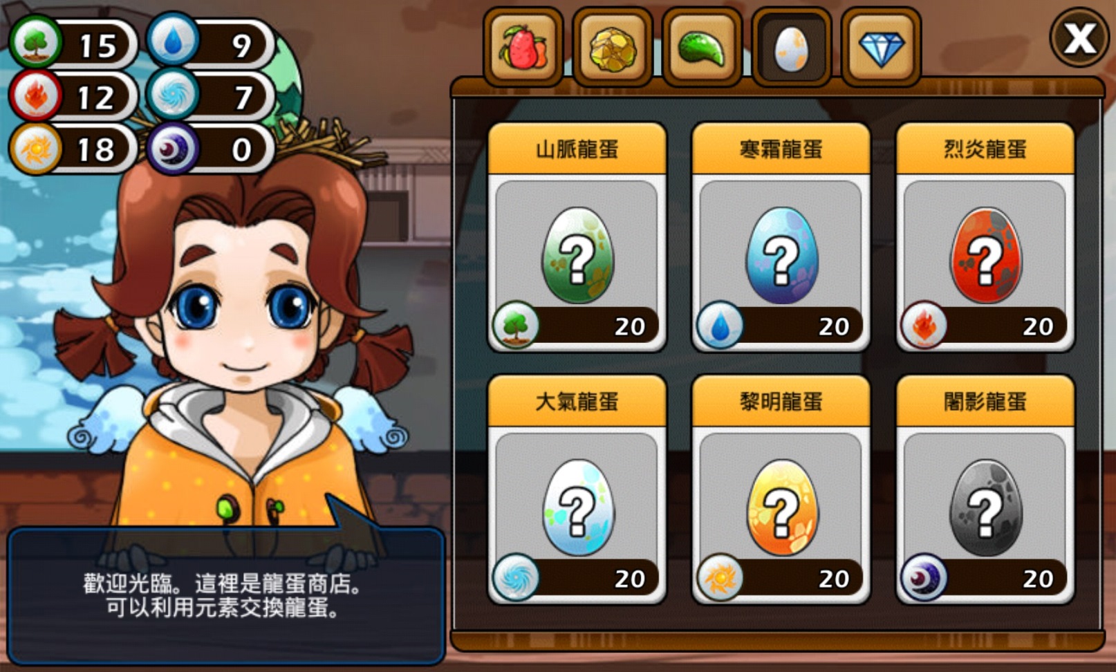 此外,除了可以在冒險地區探索龍蛋外,還可至「村莊商店」花費元素來兌換相應龍蛋,而元素也有分屬性,共有水、火、土、風、光、暗…六大屬性,透過不同冒險地區,可獲得相對應元素,只要集滿一定數量,就可兌換你想要的屬性龍蛋。遊戲內還有任務系統,玩家可透過達成任務來獲取一些強化或治療神龍的道具。