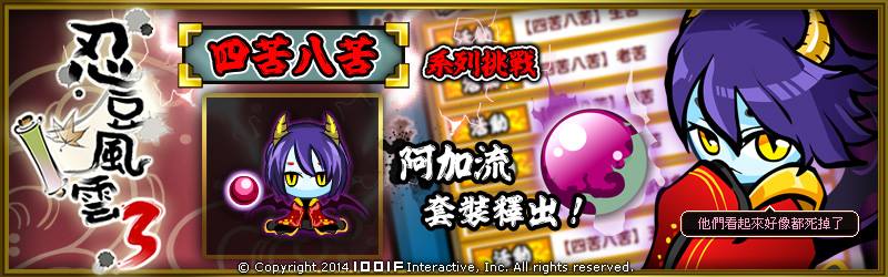 在佛家語中,「四苦八苦」代表著生命中種種磨難以及隨之而來的痛苦。對於忍者來說,也唯有透過克服修行路上的千百種磨難,才能在精神與武力上得到成長,成為一個更傑出的鬥士!在暑假的特殊活動中,玩家只要完成《四苦八苦》系列任務,證明自己全能的身手。即可於當週維修後獲得兩件史詩級服飾【阿加流-鬼猛玉與和服】與【阿加流-髮型】。活動直到八月底結束,是不可錯過的一套稀世珍品。