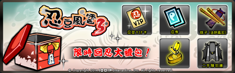 只要是離開一段時間沒有玩忍豆的老玩家, 在暑假期間只要登入遊戲,即可獲得【限時回忍大禮包】,內容包含了一把中高階武器【筷子】、一件老戰士專屬的【二手陣羽織】,還有一些金幣與卡片。不是最珍貴,但保證非常實惠好用。