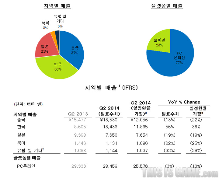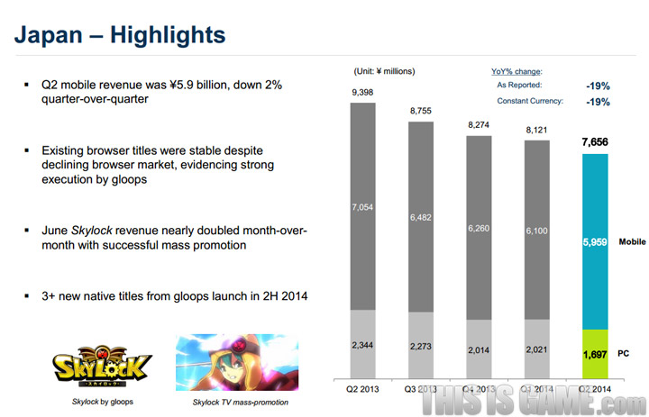 日本區營收減少的確雖與線上遊戲有關,但主要原因還是手機遊戲的部分沒亮眼表現,因為 NEXON 收購的日本開發公司 In Blue 與 Gloops 沒做出太大的表現,2013 年第二季創下 70 億日圓營收的日本區手機遊戲部門,在今年第二季營收下滑至 60 億日圓。