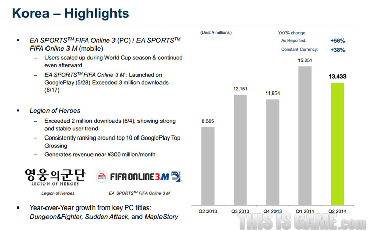 FIFA Online 3》,第二季韓國營收為 134 億日圓,與去年同期相比成長了 56%。