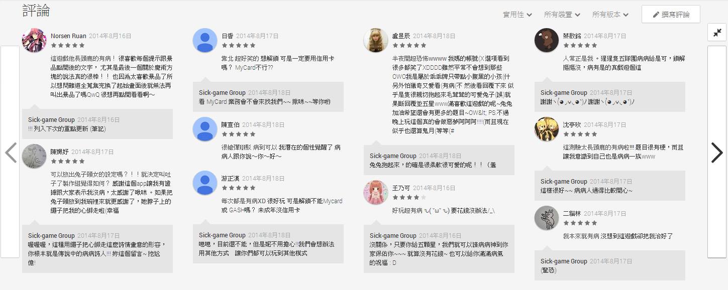 哈利菠菜:要說最深刻的意見,其實蠻多的耶,點開 Google Play 看留言,真的可以感受到玩家們的創意跟點子,像是「病病遊戲好玩! 別聞我為什麼,因為我很香~」、「什麼我有病 中路單挑啦 乾」... 這類比較無厘頭的留言,其實都蠻印象深刻的。