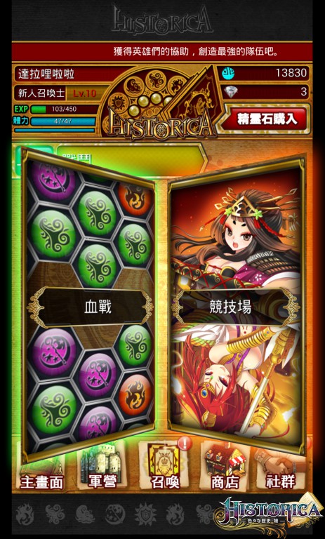 Historica》中的黑暗英雄,玩家除了採取刺激的一分鐘戰鬥「任務系統」,另一種則是使用消耗敵方血量的「血戰系統」,血戰系統單純以淨化靈魂為目標,採取持久戰方式故不限制時間,進入血戰系統後,敵我雙方將會顯現出自身血量,只要讓敵方黑暗英雄的血量歸零即可獲得勝利。淨化黑暗英雄後玩家可以取得任務系統中無法取得的各種裝備,增強歷史娘的實力!此外,血戰系統通關後還能獲得精靈石獎勵,玩家可蒐集精靈石召喚更多的歷史娘以擴充歷史娘軍團呦!