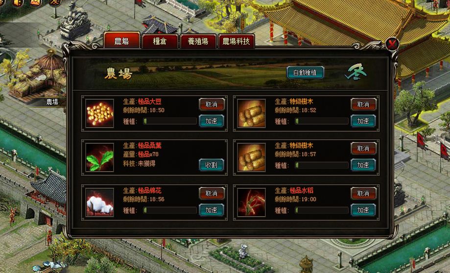 農場科技的技能需要通過多人副本才能取得,角色的等級愈高則可以養殖愈高品質的物品。多餘的裝備、寶石、馬匹、武將等物品,可通過集市與其他玩家進行交易。